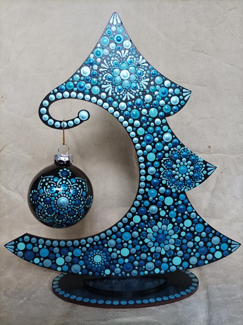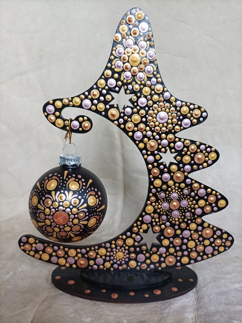 21 cm magas, 6 cm-es üveggömb dísszel, fa alap